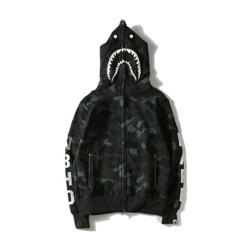 bape 外套是品牌最具代表性的單品之一。獨特的全拉鍊帽設計能完整包覆頭部,帽側印有鯊魚牙齒與眼睛圖案,極具辨識度與個性。